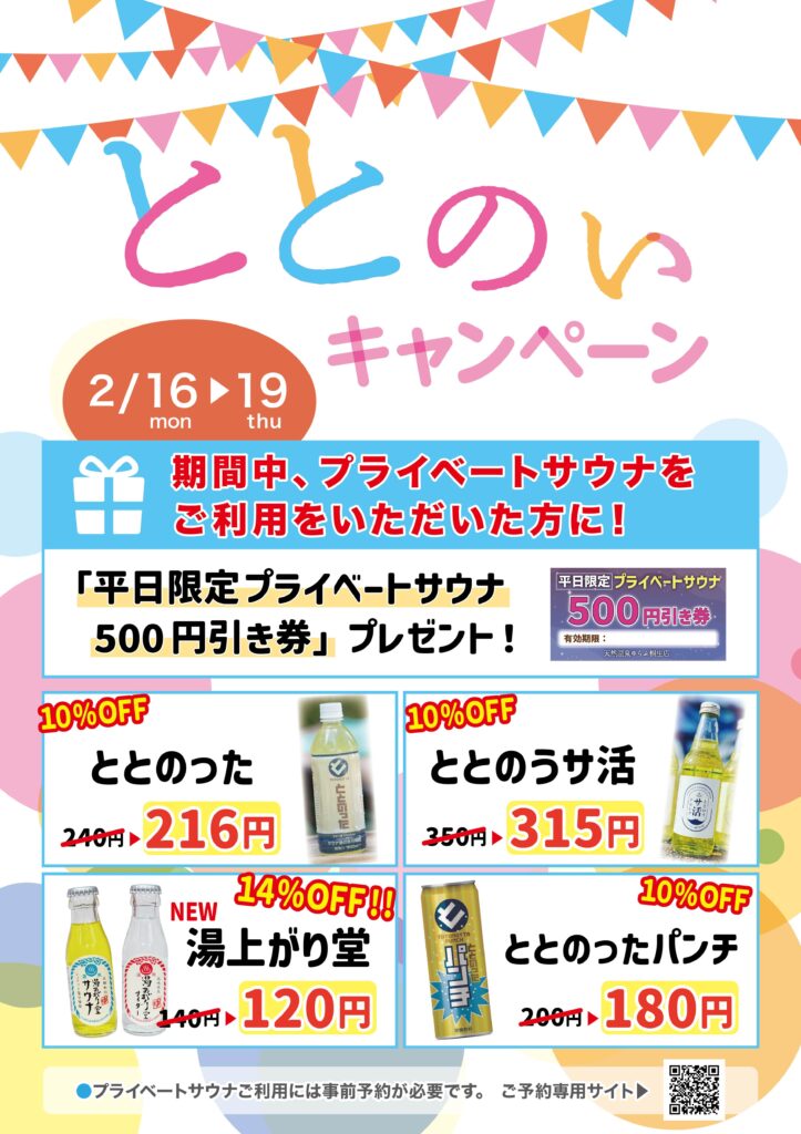 「平日限定プライベートサウナ500円引き券」プレゼント!