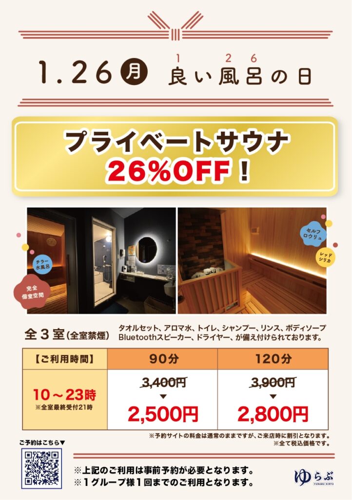 ゆらぶ桐生店ではプライベートサウナのご利用が26%OFF❗️❗️