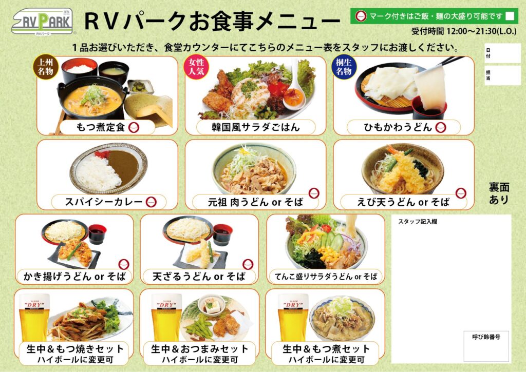 《 RVパークのお食事メニュー 》