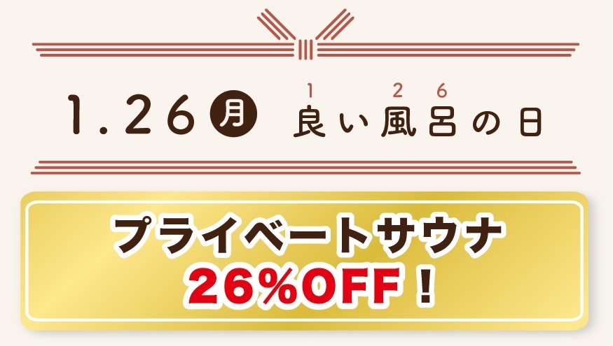 1月26日は語呂合わせで「良い風呂の日」❗️ゆらぶ桐生店ではプライベートサウナのご利用が26%OFF❗️❗️お得にご利用いただけます✨ ーーーーーーーーーーーーーーーーーーーーーーーーーーー■ プライベートサウナ 1/2…